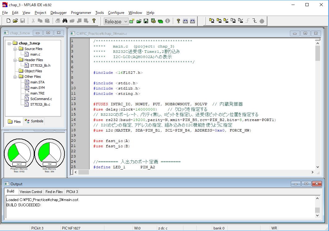 ![]() メニューの 「Project - Build All」を実行するとコンパイルが実行され、Output 画面に、BUILD SUCCEEDED が表示されれば、成功です。プロジェクトフォルダに、「main.hex」ファイルができているはずです。 先の例のように接続し、PICkit 3 の USBケーブルをパソコンに接続し、ターゲットの電源を入れて置き、書き込んでください。 このサンプルは、非常に単純です。タイマ1、タイマ2、RS232C も「chap2_1」と同じ設定で入れていますが具体的には使っていません。ですが、特にこれらが特別な他の用途がない限り、これらを入れておくと大変に便利です。 main関数の・・・ while(true) { DSW_DT = ~input_b(); // ロータリーSWの読み込み output_a(DSW_DT << 2); // PORTA のLEDに出力する exe_command(); // Execute RS232C Command } ・・・の部分によって、ロータリーSWの数値が LEDに BCD (Binary Coded Decimal)で表示されていることが分かります。このような単純なプロジェクトの時に、「ビット演算子」や「シフト演算子」のテストを十分にされることをお勧めします 例えば、RS232Cのコマンド "T1"を入力するとテラタームの画面では・・・ T1 SW_DT: 09 SW_DT: F6 ・・・と表示され、ロータリーSWの数値の状況を、そのまま読んだ値とリバース(1の補数)した値を比較して納得することができます(ロータリーSWの数値は、下の1桁)。 このように、RS232Cのモニタに自分のテスト用の短いプログラムを組み込んで様々なテストをして見てください。 3. LCD(ACM1602NI)への表示(I2C) 学習用のフォルダ「C:\PIC_Practice\chap2_2」を作成し、その中に main.c, SciCommand.c, ACM1602_lib.c, ACM1602_lib.h を入れて下さい。下のリストの各ファイル の範囲をドラッグして選択し、メモ帳などのエディタに貼り付けて、名前を付けて保存で各ファイルを作ってください。もちろん、LCD(ACM1602NI)を取り付けておいてください。このLCDは、秋月電子工房さんで取り扱っています。