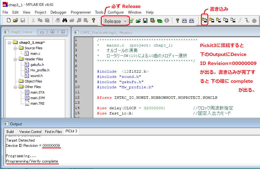 ![]() Step3で、Project File を Browse してホルダ「chap3_1」の中にchap3_1.mcp 作成し、Step4で、main関数である main.c のみを Add します。以上で新プロジェクトの設定は完了です。「次へ」をクリックして行ってください。 ![]() 「完了」をクリックすると、新プロジェクトが立ち上がります。メニュー「View」のProject と Output にチェックを入れます。また、下図のように、「Build Configration」を必ず Debug から Release にしてください。 ![]() main.c は、Project Wizardで既に追加しています。3個のヘッダーファイル(gakufu.h, Hw_profile.h, sound.h)は main.c 内で #include されているのでコンパイルはできますが、上図の「Header Files」のように、それらを取り込んで置くと参照・編集ができます。「Project - Build All」 を実行して Output に 'Build Successful.' が出れば成功です。フォルダ「chap3_1」の中に、main.hex ファイルができているはずです。 その main.hex を書き込んで走らせて見たいと思います。左の写真のように接続してください。USART は使っていないのではずして良いです。PIC12F1822 は、ピン数が少ないので書き込みピンはデジタルSWの入力と共用していますので、書き込む時はデジタルSWを必ず「0」にしてください。もし、デジタルSWを「0」にしないままですと、デバイスが認識されません。 PICkit3を接続し、基板の電源を入れてメニューの「Programmer - Select Programmer - 6.PICkit3」にチェックを入れて下さい。上の図の Output のように「Device ID Revision = 00000009」と出れば接続・認識完了となります。 この時、デバイスが認識できない時は、メニューの 「Select Programmer」で、「None」を選択し、一旦 MPLAB-IDE からPICkit3 を切り離します。そして、最初に説明しインストールしている [MPLAB IPE]を起動して、これを使ってこのターゲットに接続し認識させれば、これ以降はMPLAB-IDEから、上のやり方で書き込めるようになります。もちろんこのMPLAB-IPEから、書き込むファイル(main.hex)を指定してそのまま書き込むこともできます。MPLAB-IDEで、今までに使ったことのないデバイスを書き込む場合は、このMPLAB-IPEで一度アクセスする必要があります。 さて、MPLAB-IDEから上記の操作を実行して「Device ID Revision = 00000009」が出てターゲットが認識されると、上図のように Programmer に関するメニューが追加されますので、メニューの中の「Program (書き込みと赤枠で囲っている)」を実行します。Outputウィンドウに「Programming/Verify complete」が表示されれば書き込み完了です。CN-PRGのコネクタからケーブルを抜いて基板から PICkit3 を切り離します。書き込みピンとI/Oピンを共用しているので、書き込み完了後は、このケーブルを抜いてください。 これで基板はすでに動作しています。 SW-ST の押し釦SWを押すと、デジタルSW(Select Melody)で選択されている曲のメロディが演奏されます。ボリューム(VR)で音量を調整してください。演奏の途中に、もう一度 SW-ST を押すと、演奏を中断し待機に入ります。デジタルSW(Select Melody)の切り替えで 10曲の選択ができます。 回路図を参照していただければ分かりますように、デジタルSWを「0」とすれば、コネクタ(CN-EXT) から、この基板をコントロールすることができます。すなわち、選曲とスタートSWの操作が外部からできます。また、スライドSWを「EXT SP」側に切り換えると CN-EXTの「+ , -」端子から外部スピーカーを駆動することができます。外部スピーカー(例えば直径5cm程度)を使えば、かなり良い音が出ていることが分かると思います。 このプログラムの簡単な説明は、前章の chap2-12 で説明しましたので参照してください。そこでも書いておりますが、 このオルゴールは、「松田工作様」のコードを使わせていただいております。その方のサイトでは、「オルゴールの楽譜作成方法」も公開されていますので、色々と曲の変更などもできます。 【動かしましょう−4】 ここでは PIC16F1619を動かしてみます。こちら にリンクします。 【 参考 】 XC8 から CCS-Cへの移植例 ラズパイ Zero によるインターネット・ラジオ |