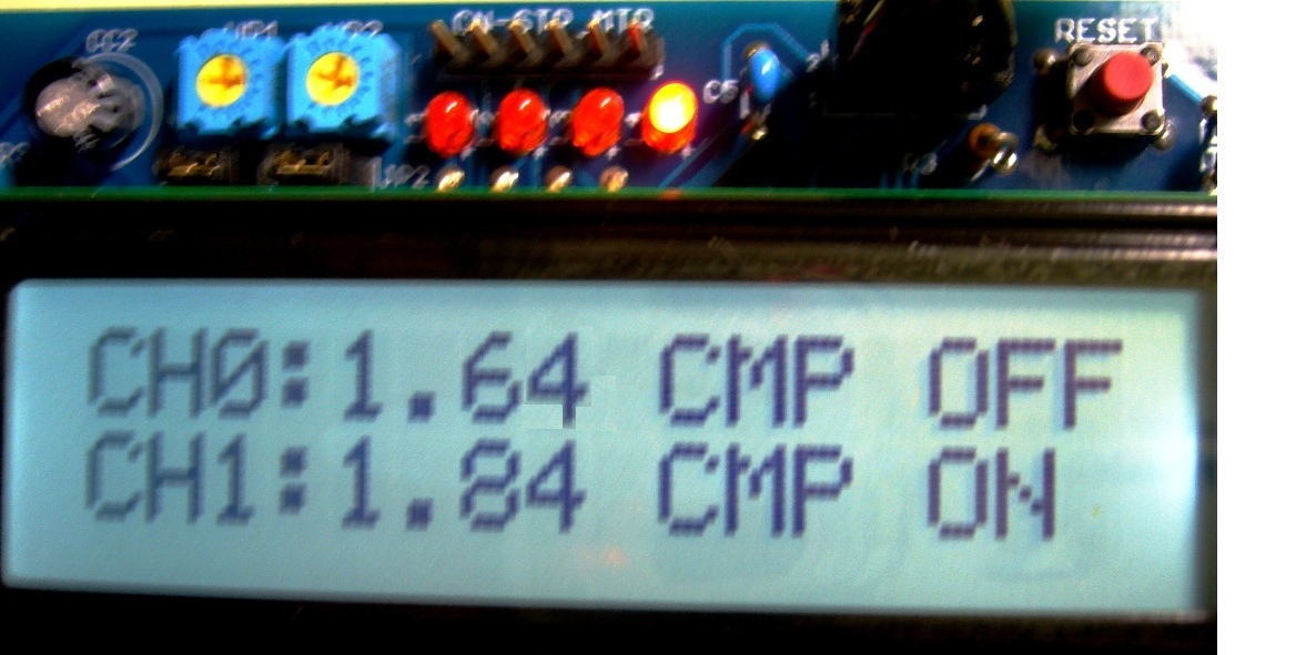 ![]() メニューの 「Project - Build All」を実行するとコンパイルが実行され、Output 画面に、BUILD SUCCEEDED が表示されれば、成功です。プロジェクトフォルダに、「main.hex」ファイルができているはずです。 先の例のように接続し、PICkit 3 の USBケーブルをパソコンに接続し、ターゲットの電源を入れて置き、書き込んでください。 このプロジェクトは、先の PIC16F1827の chap5 と動作的には全く同じです。ただ大きく異なるのはLCDの仕様がかなり違っていることです。先のLCDは、AQM0802A であり、そのライブラリファイルは、ST7032i_lib.c、ST7032i_lib.h で、コマンドの先頭に stiLCD_・・・という接頭文字がついていました。 今回は、ACM1602NI で、ライブラリファイルは、ACM1602_lib.c, ACM1602_lib.h であり、コマンドの先頭に acmLCD・・・という接頭文字を持っています。 接頭文字以降のコマンド名は、まったく同じになっていますから、同類のものの接頭文字を入れ替えればそのまま動作させることができます。 まったく違っているのがコントラスト調整です。先のAQM0802Aがコマンドでコントラストを変更したのに対して、これで使っている ACM1602NI は、外付けボリュームで行います。図のオレンジで囲っているボリームです。 動作は、図の上の方にある VR1 を廻すと LCD の一行目の CH0 の数値とレベルバーが変化します。 数値は 0.00 〜 3.30 の間をボリュームの調節にしたがって変わります。 同様に、その右隣りにある VR2 を廻すと LCDの二行目 の CH1 の数値とレベルバーが変化します。 動きは chap5 とまったく同じですので、ソフトウェアの解説については、そちらをご参照ください。 6. コンパレータの動作テスト 学習用のフォルダ「C:\PIC_Practice\chap2_6」を作成し、その中に main.c, SciCommand.c, ACM1602_lib.c, ACM1602_lib.h を入れて下さい。下のリストの各ファイル の範囲をドラッグして選択し、メモ帳などのエディタに貼り付けて、名前を付けて保存で各ファイルを作ってください。もちろん、LCD(ACM1602NI)を取り付けておき、アナログの内部入力を取り込むための JP1, JP2 を接続してください。